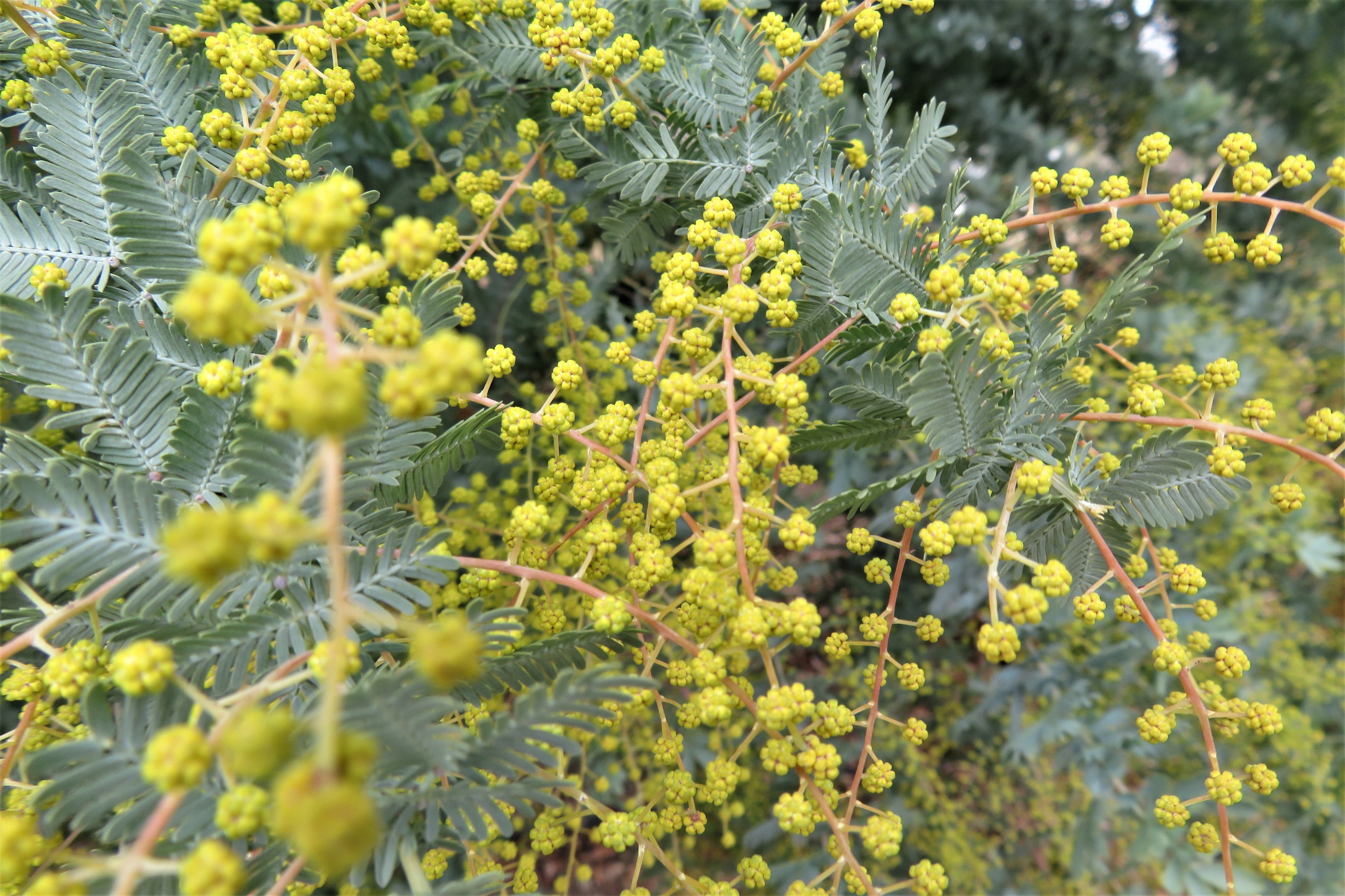 お馴染みのミモザですが、ミモザはオジギソウのことです。正式名は、オーストラリア原産でマメ科のギンヨウアカシアです。園内にはミモサアカシアもあります。